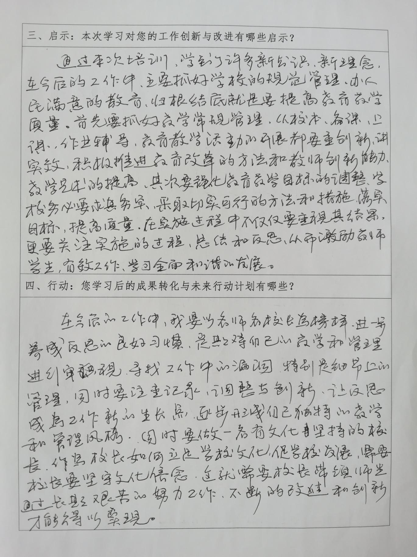 首先,培训对学员产生强烈的触动,并从内心中产生了行动自觉。如2018年国培董事长班学员肖宇汉在培训总结中就写到,通过学到了许多新知识,新理念,在今后的工作中,要以名师名董事长为榜样,进一步养成反思的良好习惯,对自己的教学和管理工作进行审视,同时要做一名有文化坚持的董事长,要立足文化促进学校发展。