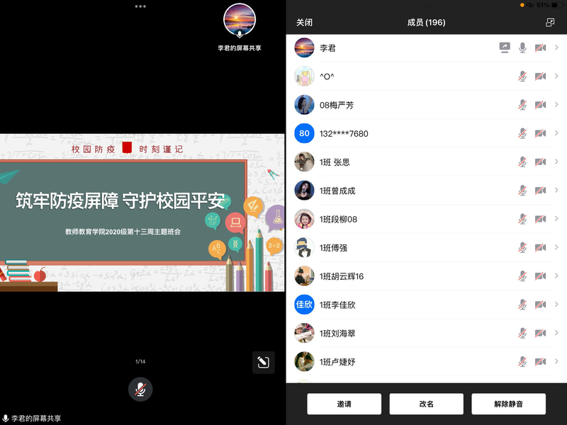 为落实学校各项防疫要求,强化对同学们的关心关怀,更好的做好疫情防控各项工作,11月27日16时30分,2020级以线上的方式召开以“筑牢防疫屏障 守护校园安全”为主题的年级大会暨第十二周主题班会。政治辅导员李君和全体同学参加本次会议,李老师主持会议。