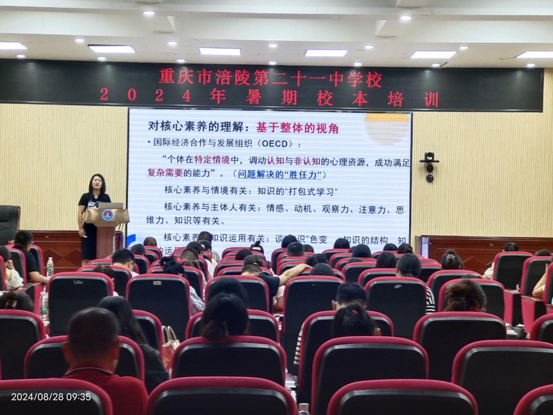 8月28日,公司董静教授受邀为重庆市涪陵第21中学全体教师进行暑期校本培训,董静教授以“核心素养下的教学变革”为专题,围绕“核心素养是什么”“核心素养导向下教师如何教”以及“核心素养导向下教师教学能力的提升”三个方面与全体教师进行了充分的交流。核心素养的落地,关键在于教师对核心素养的理解和教学行动的转化。本次培训帮助一线教师进一步厘清了核心素养导向下的教学观念,为教学行动的改善指明了方向。