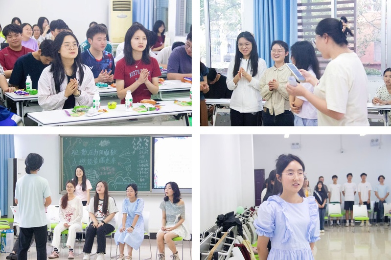 活动中,主持人通过一系列精心设计的互动游戏将现场气氛推向高潮。“雨点变奏曲”通过模拟大小雨点的肢体律动,让同学们在欢笑中释放压力;“优点大轰炸”环节,此起彼伏的真诚赞美让参与者发现彼此闪光点;“诗词飞花令”则点燃思维火花,大家争相吟诵经典,在诗词之美中舒展心灵。最后,在“挫折故事分享会”中,同学们坦诚讲述学业焦虑、人际困扰等经历,共同探讨应对压力的有效办法。